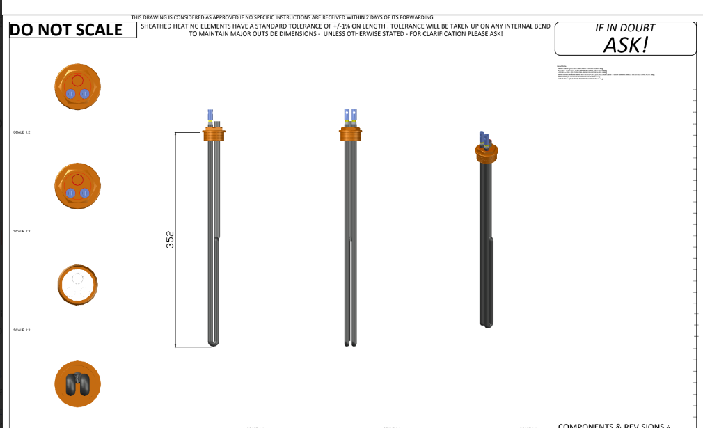Within the limitations listed above, it is best we have a conversation about your 1″BSP Immersion Heater needs, so call Jamie on 01827 215684 to discuss, in order to co-design the best heater to suit your needs. Your maximum immersed length will be key, with only 2 looped elements to play with, so get your tape measure out, keep it stiff, and stick it through your hole to see how long we can go with those elements. And don’t have a stat pocket unless you really need one. There are benefits to having your heater made bespoke as it allows you to precisely hit your requirements, rather than taking a “Best Fit” off the shelf.