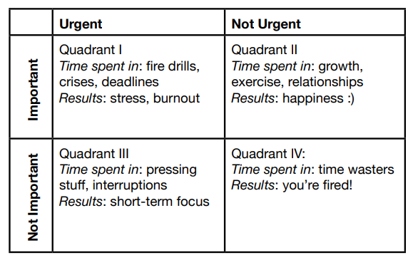 - Put First Things First. Prioritise “Wildly Important Goals” or What’s Important Now” FOCUS ON THEM ALONE. Politely say No to other things. The enemy of the great is often the good.